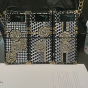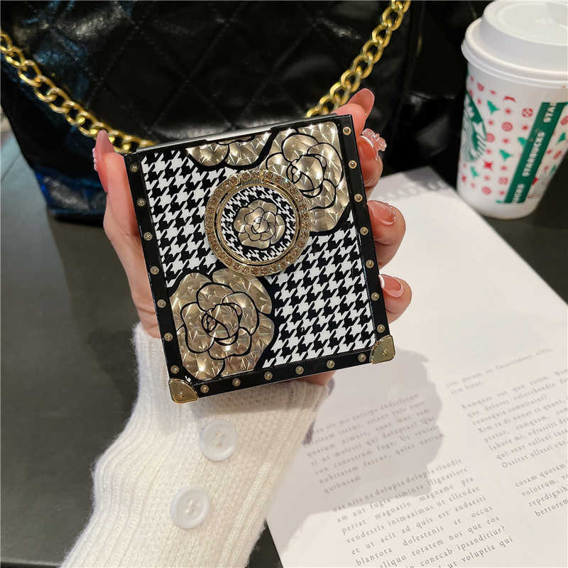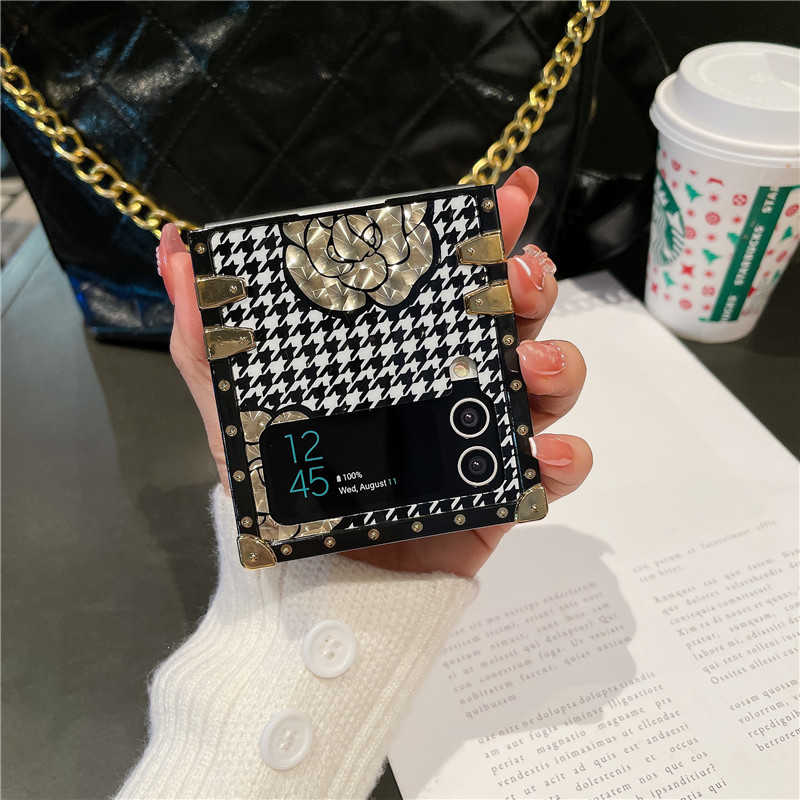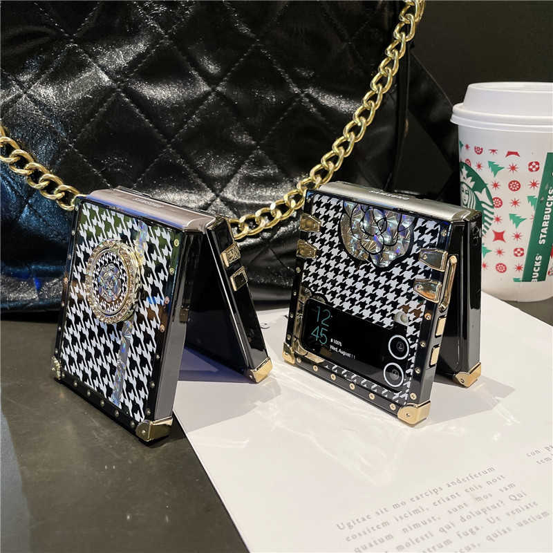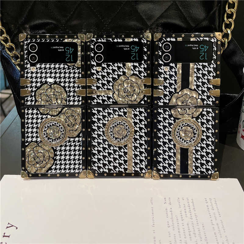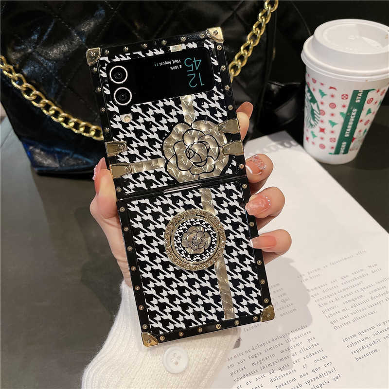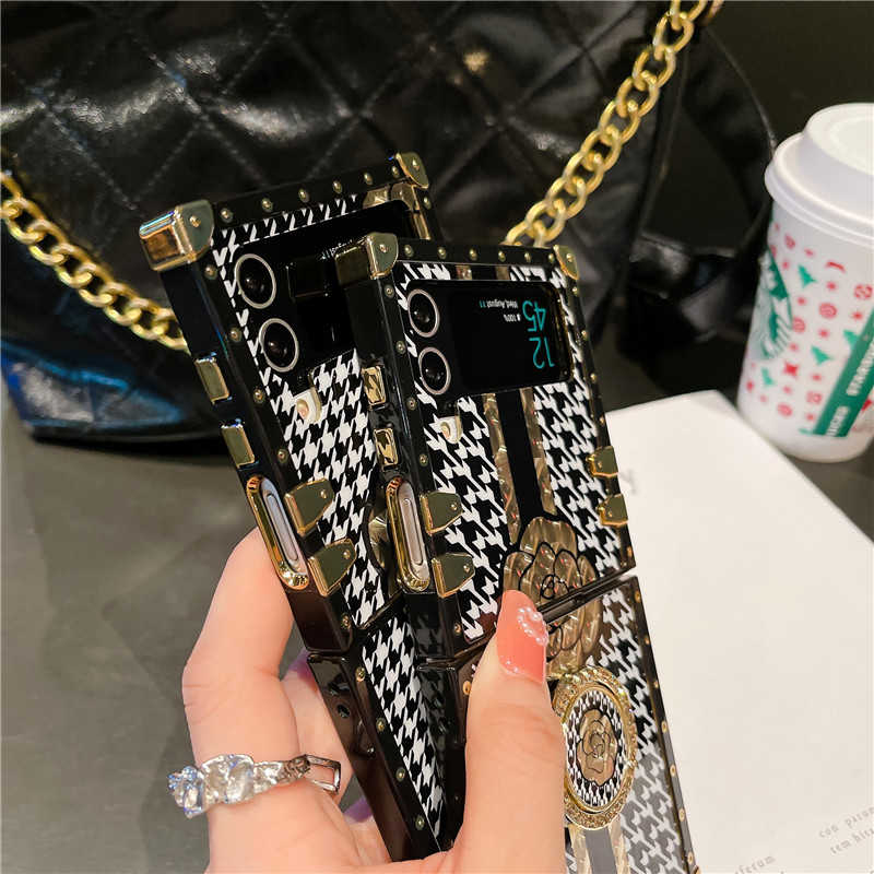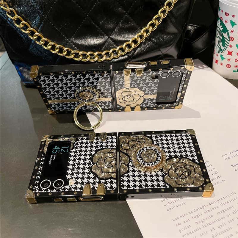 Gold Flower Houndstooth Galaxy Z Flip Phone Case with Ring